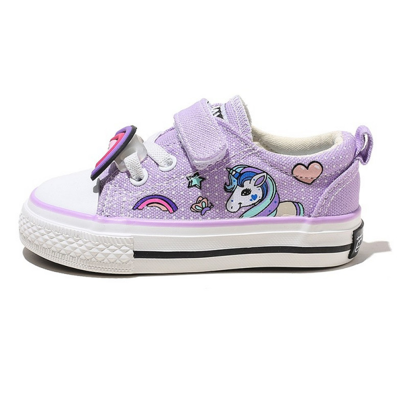 BABAYA PATIKE LILIAC Broj: 20 Duzina gazista: 15 cm Boja: ljubicasta Ukrasne elasticne pertle, zatvaranje cicak trakom. Motiv: jednorog, duga Nove sa kutijom