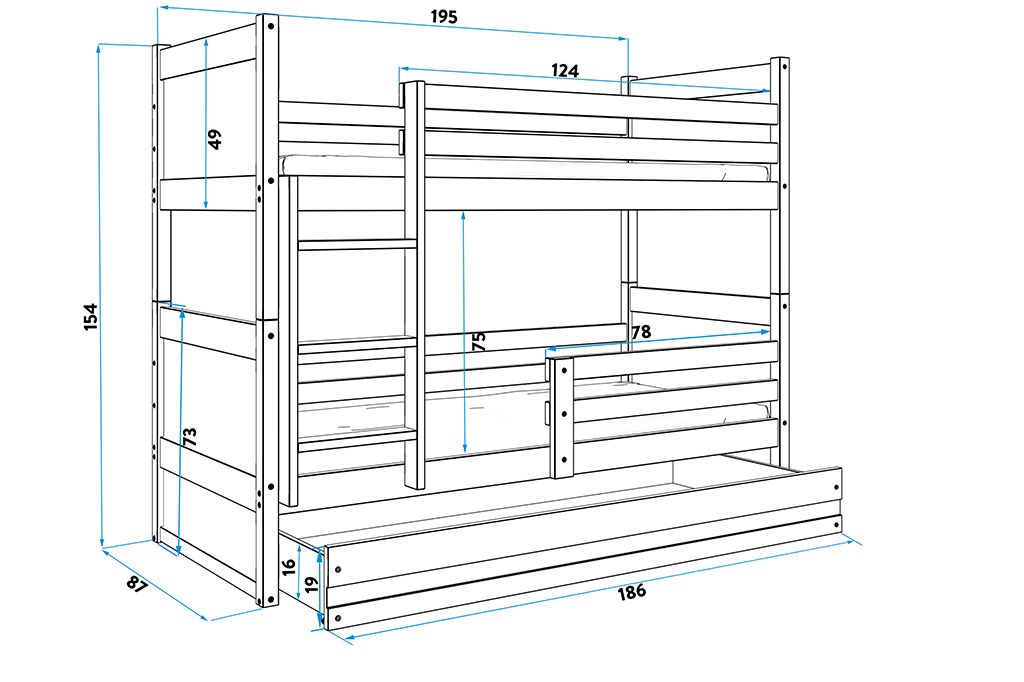 Krevet Premium kvaliteta Bonny je za ljude koji cene funkcionalnost, moderan dizajn i kvalitet izrade. Krevet je namenjen za dve osobe Njegov stabilan dizajn osigurava bezbednost i udobnost za vaše dete. Okvir kreveta je napravljen od visoko kvalitetnog borovog drveta. Stranice kreveta su napravljene u potpunosti od kvalitetnih MDF materijala i sve ivice su zaobljene i dizajnirane za bezbedno korišćenje od strane dece. Uz krevet dobijate dušek BESPLATNO !!! Dušek je debljine 7cm Dimenzije: Dužina kreveta: 195 cm Širina kreveta: 87 cm Visina kreveta: 154 cm Površina za spavanje: 190cm x 80 cm |
