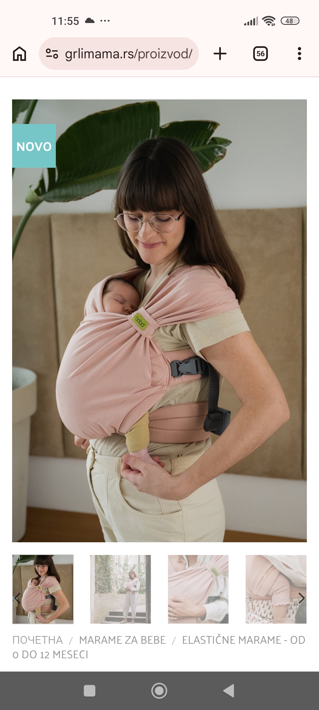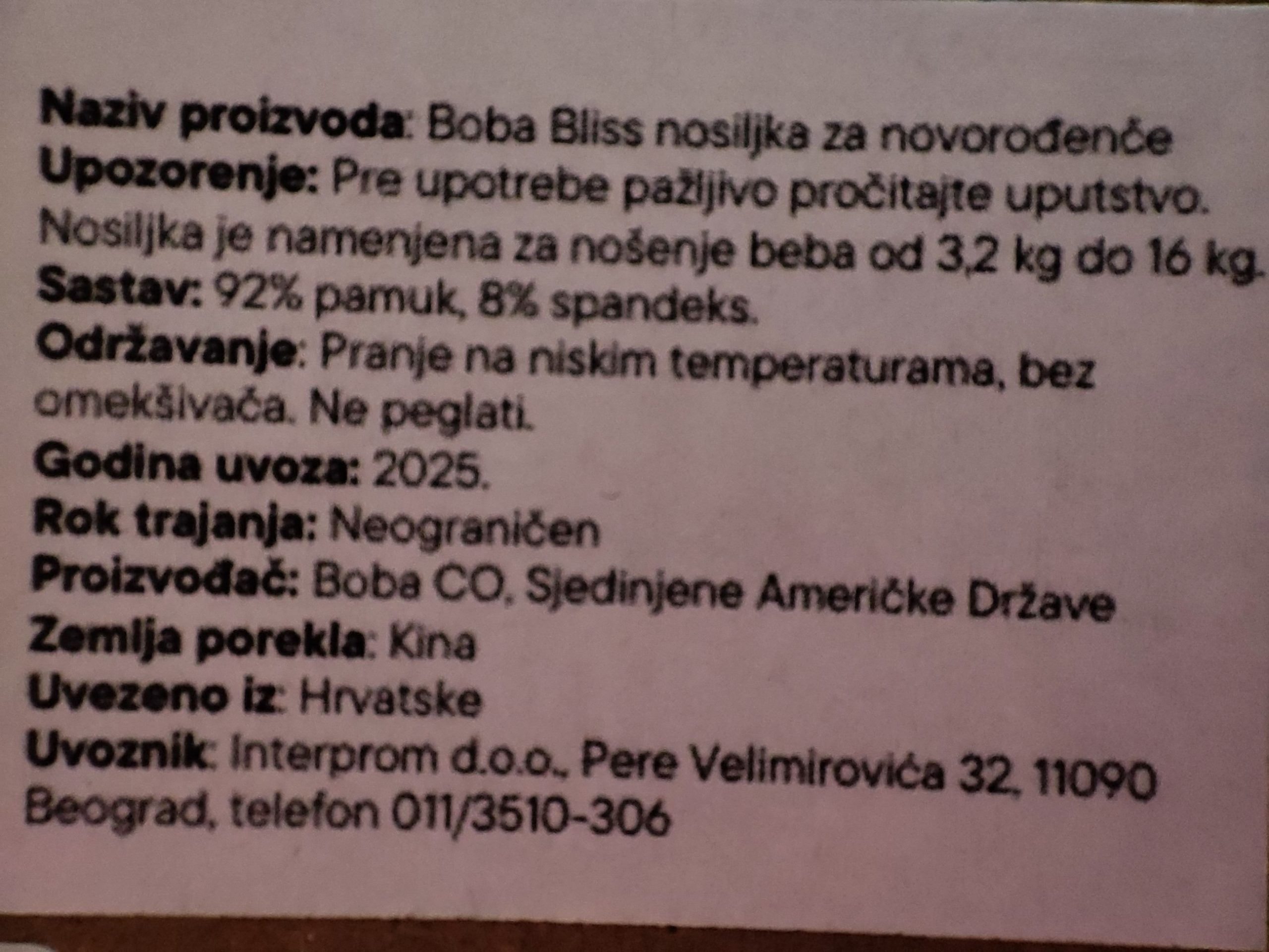 Odlična nosiljka, za 10 sekundi se montira sa bebom, ali nažalost zbog mojih problema sa leđima uopšte je nismo nosili. Posebno pogodno na novorođenčad, na sajtu Grli mama košta 11.500 i nema je trenutno. Godina uvoza: 2025