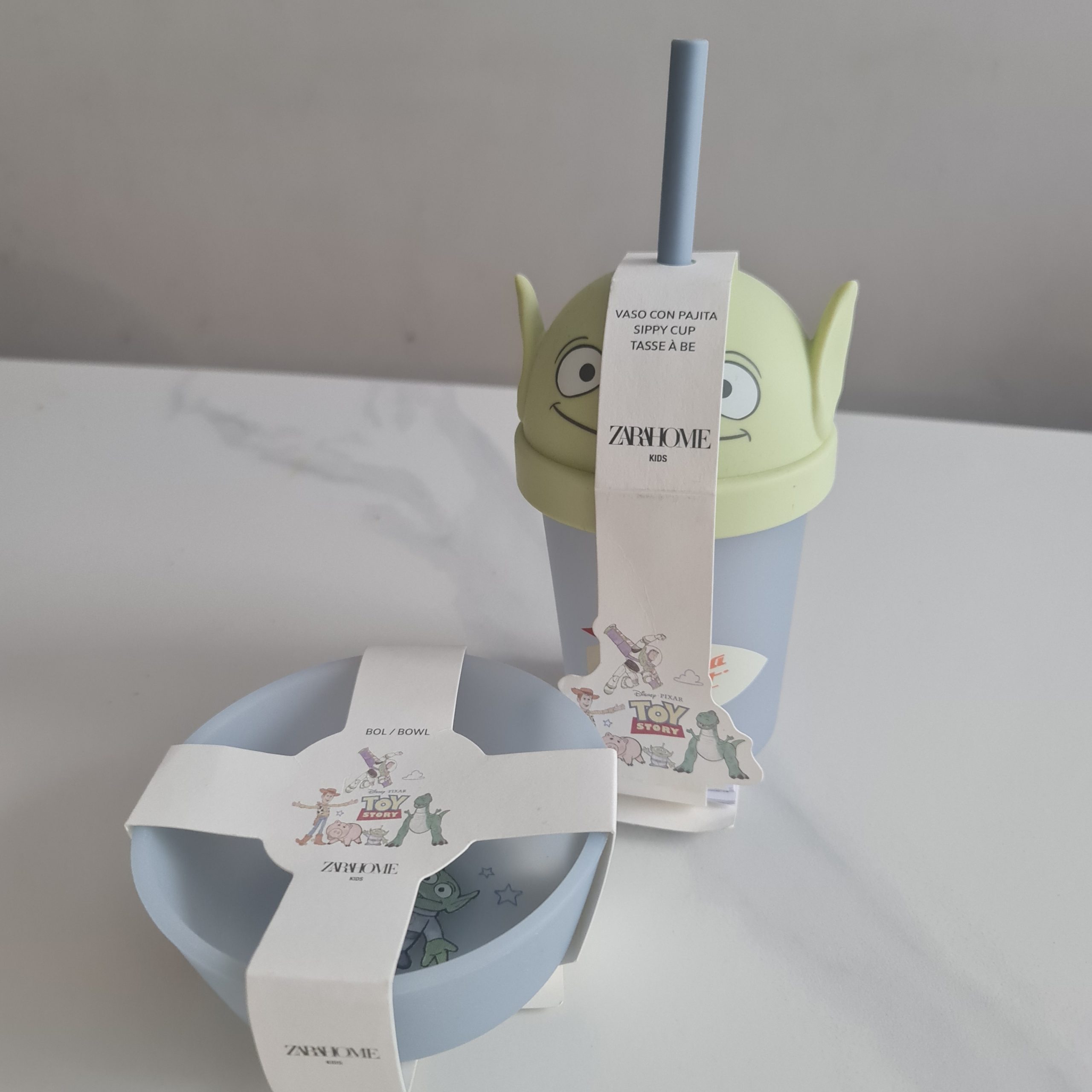 Zara Home, Toy story komplet čaša sa slamčicom i činija. 100% silikon, lako za održavanje. Činija na dnu ima vakum deo da se ne pomera po stolu.