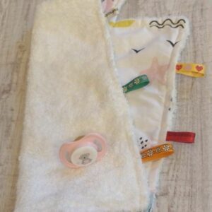 Cebe za utehu je od pamucnog platna sa jedne i mekanog pamucnog frotira sa druge strane . Vasa beba ce ga obozavati jer iz iskustva mame bebe vole kese i etikete a u ovom cebencetu imate mnogo sarenih tracica i usi koje suste.Tracice su cvrsto usivene. Mozete da zakacite cuclu ili omiljenu glodalicu vase bebe .