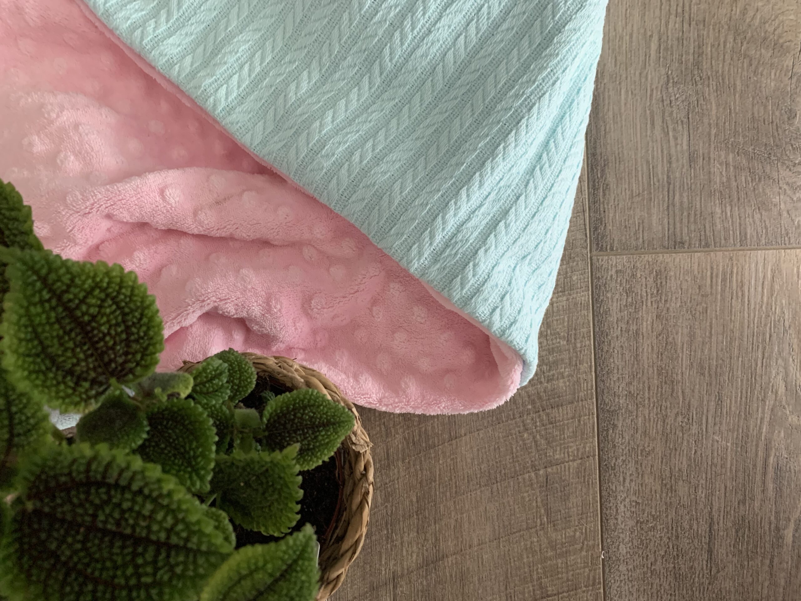 Ćebence dimenzija 75 x 100 cm. Izradjeno u kombinaciji mint pletnine, i roze bobičastog minkija.