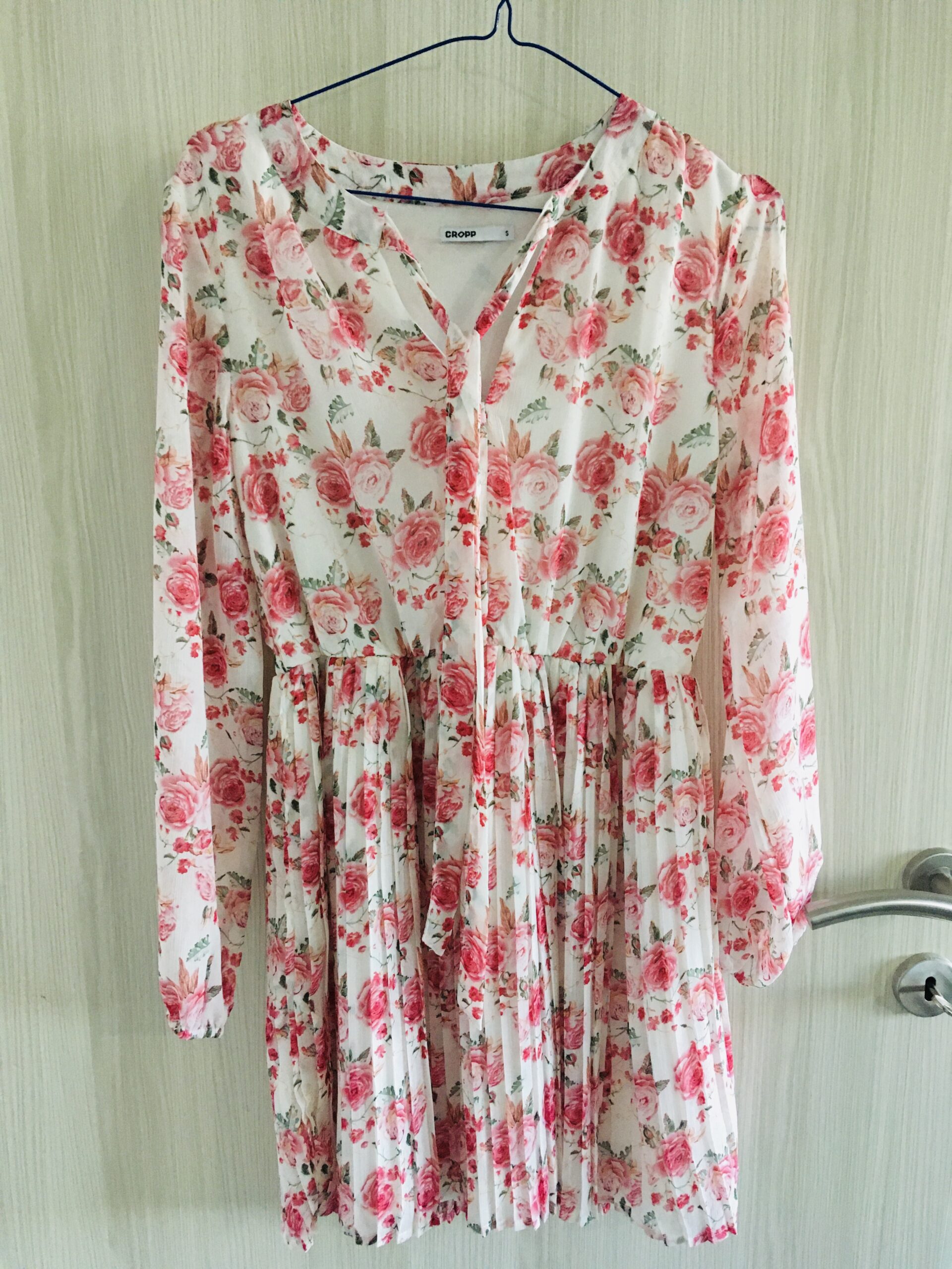 Cropp haljina sa dugim rukavima, vezuje se oko vrata. Guma na kraju rukava Velicina: S/36 Boja: bela, roze Motiv: ruza, cvet Materijal: poliester