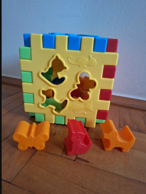 Osnovni geometrijski oblici, slova ,životinje koji se kroz oblik izbacuju u kockuKod dece stvaraju zadovoljstvo kada ih ohvalimo što su pogodili oblik i smestili ga u odgovarajuću šupljinu.
