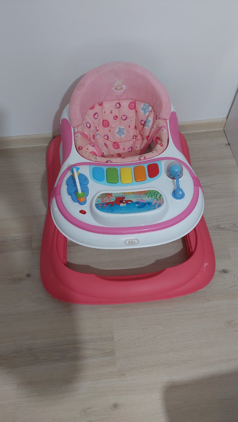 Dubak. Sa dodatnim gedzetima za animaciju i dodatnu zanimaciju bebe. Udoban, stabilan, veselih boja. Deo sa muzikom i tasterima se može skinuti pa ujedno poslužiti kao pultić da se na njega stavi neka omiljena igračka ili da se beba tu nahrani. Prava pomoć mami i tati kada im je potreban predah.