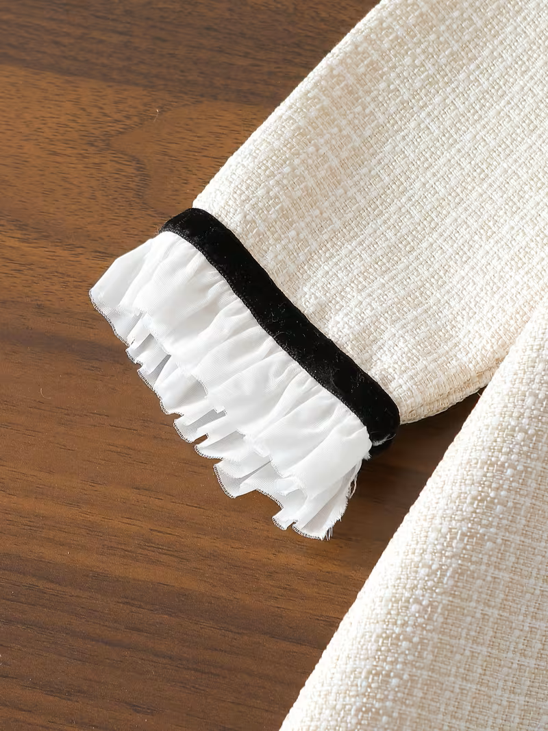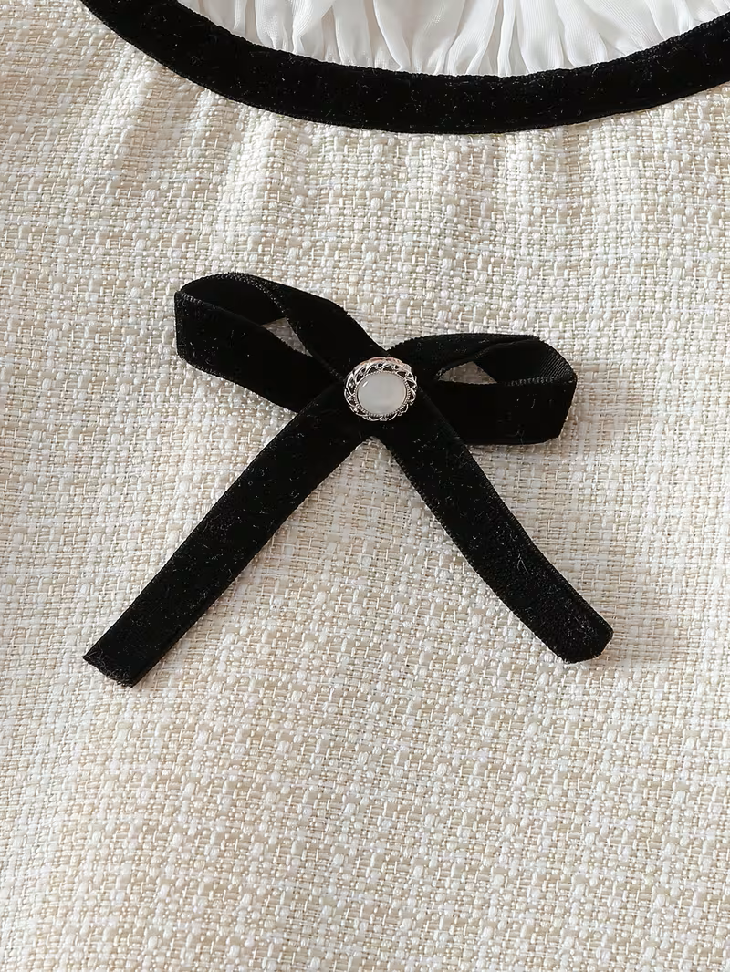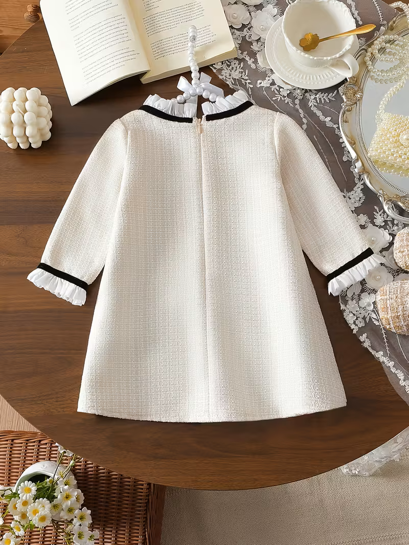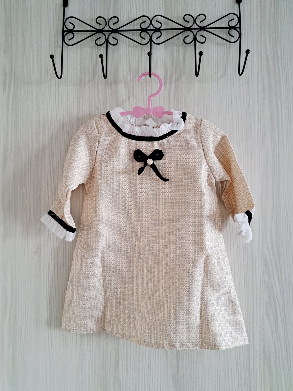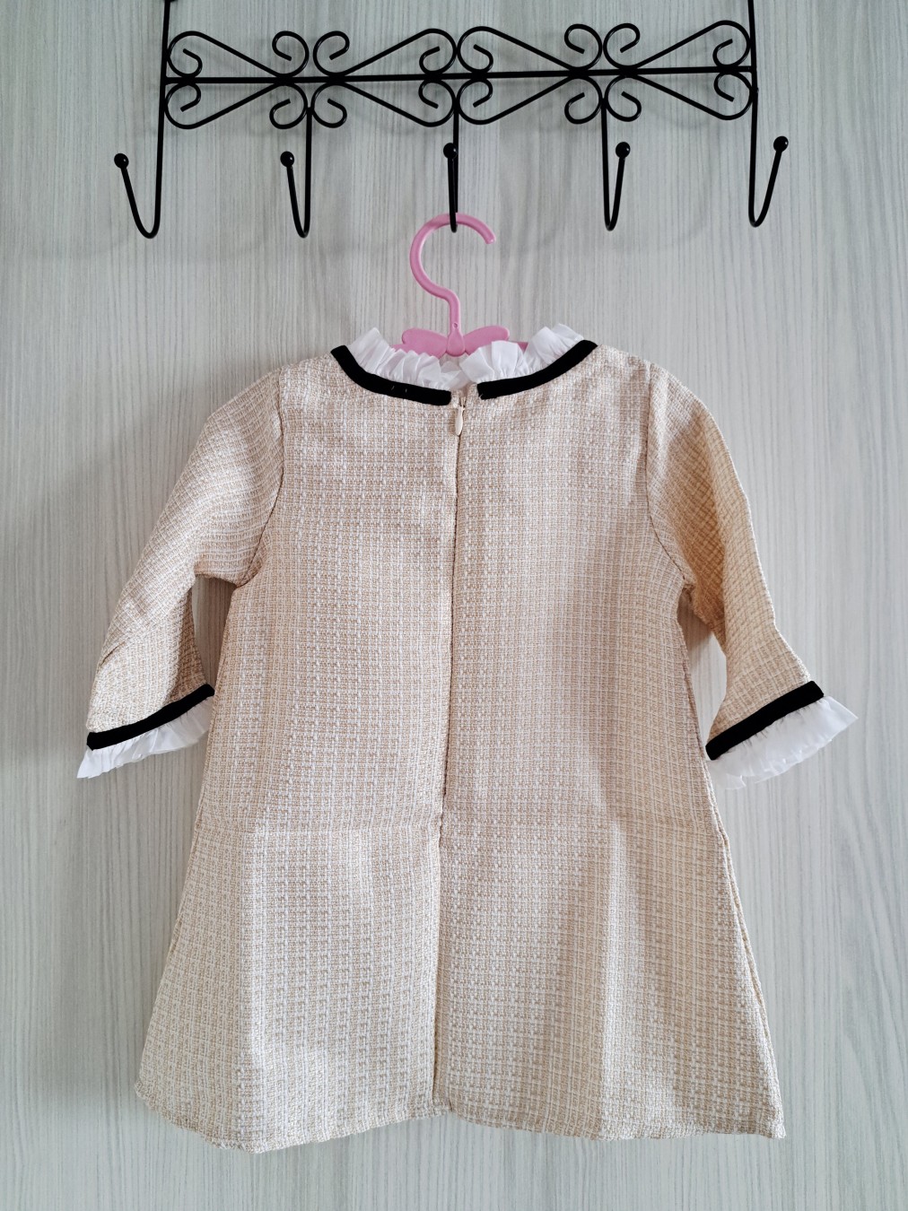Elegantna haljinica za bebe devojčice, savršena za posebne prilike Ova prelepa haljinica u krem/beloj boji odiše nežnom elegancijom. Izrađena je od finog, teksturiranog materijala, sa pažljivo biranim crnim detaljima koji joj daju poseban šarm. Na prednjem delu nalazi se mašnica kao suptilan akcenat, dok su rukavi i izrez ukrašeni blagim karnerima. Haljinica se zakopčava pozadi rajsferšlusom, što omogućava lako oblačenje i udobno nošenje. Detalji proizvoda: Veličina: 80 Uzrast: 9–12 meseci Zakopčavanje: rajsferšlus pozadi Boja: krem/bela sa crnim detaljima Stil: elegantna, svečana Idealna je za rođendane, krštenja, proslave i sve trenutke kada želite da vaša devojčica izgleda posebno i nežno