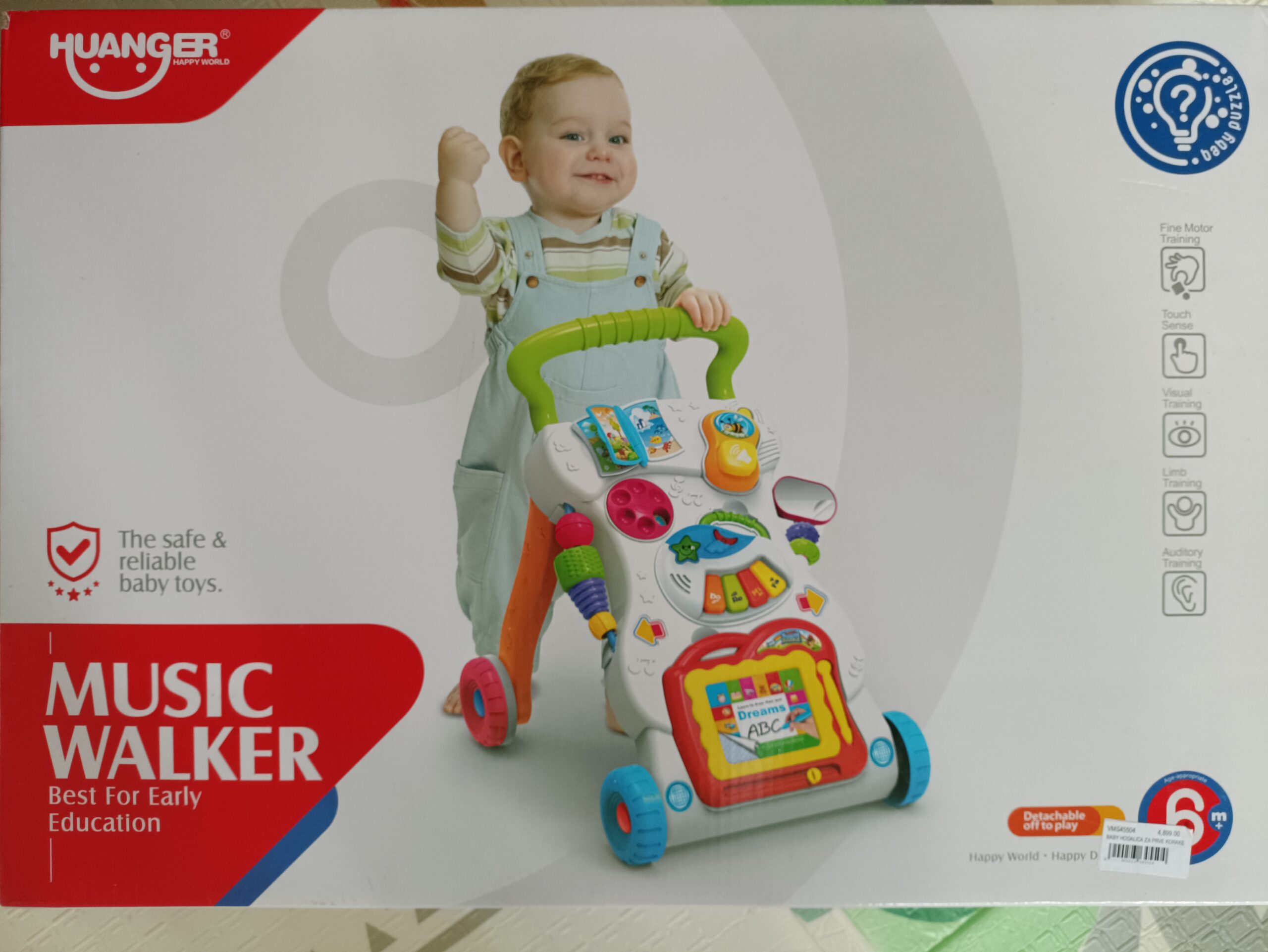 Nova, neotvorena muzička guralica proizvođača Huanger, cena na njoj 4899 din. Na njoj ima sintisajzer (odvojivi) koji pušta muziku i uspavanke, a takođe može da se svira na njemu, zatim magnetnu piši-briši tablu, mali mobilni telefon i druge pomerive zanimacije.