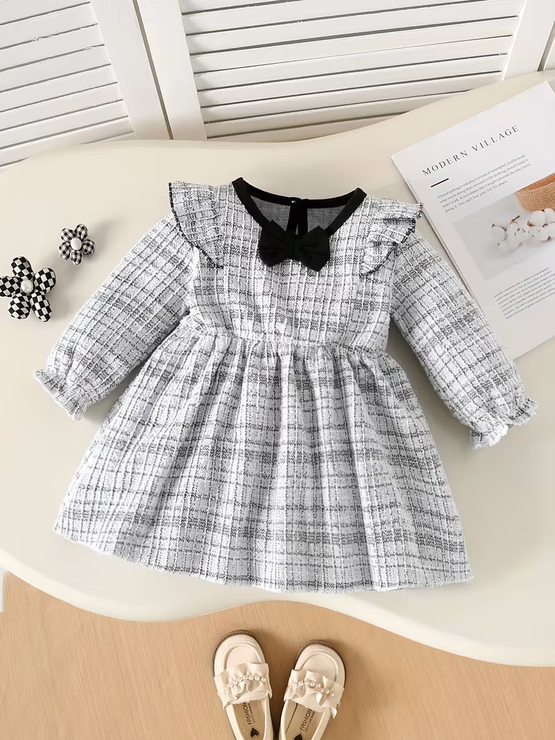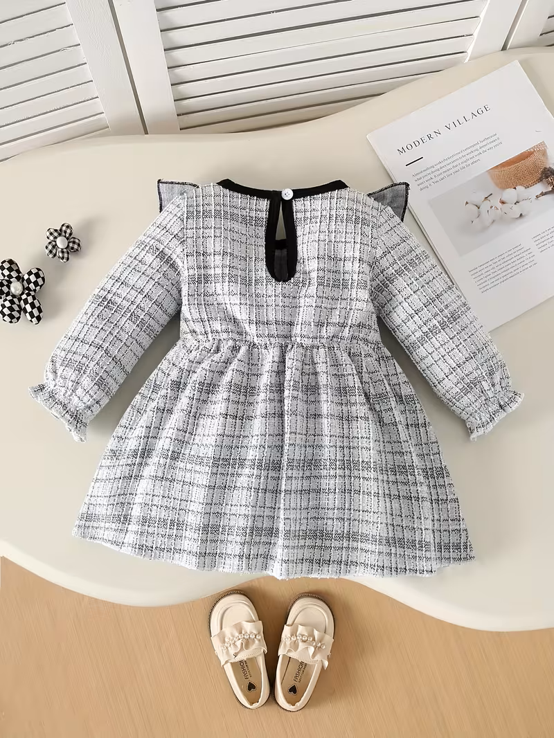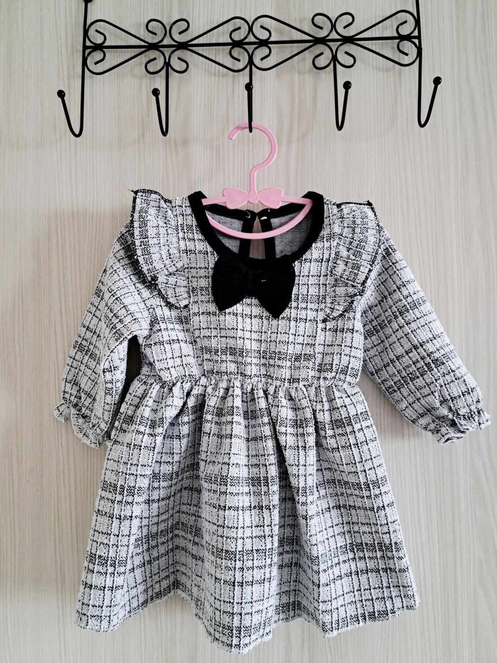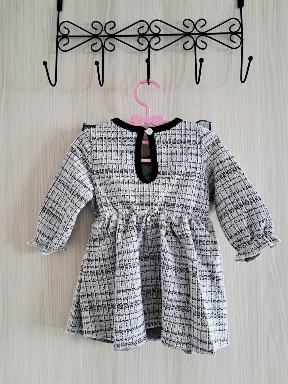Zimska haljinica za bebe devojčice – 9-12 meseci (veličina 80) Uživajte u udobnosti i stilu vaše male princeze sa ovom prelepom zimskom haljinicom. Haljinica je sivo bele karirane boje sa suptilnim crnim detaljima, savršena za praznične i svakodnevne prilike. Ima elegantnu crnu masnicu i karneriće na ramenima koji dodaju nežan i sladak izgled. Zakopcava se jednim dugmetom pozadi. Dugi rukavi sa gumicom na kraju čuvaju toplinu, dok je materijal mekan i nežan, prijatan za osetljivu kožu bebe. Idealna je za zimske dane, igre i posebne trenutke, kombinujući udobnost i šarm u jednom.