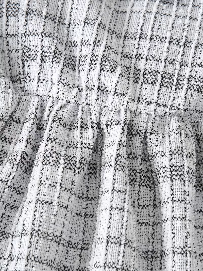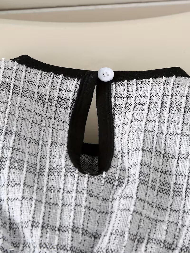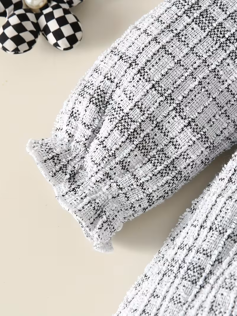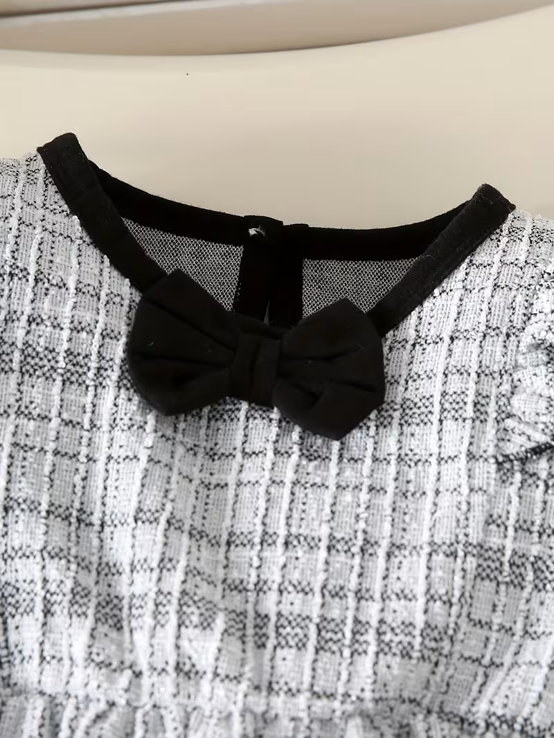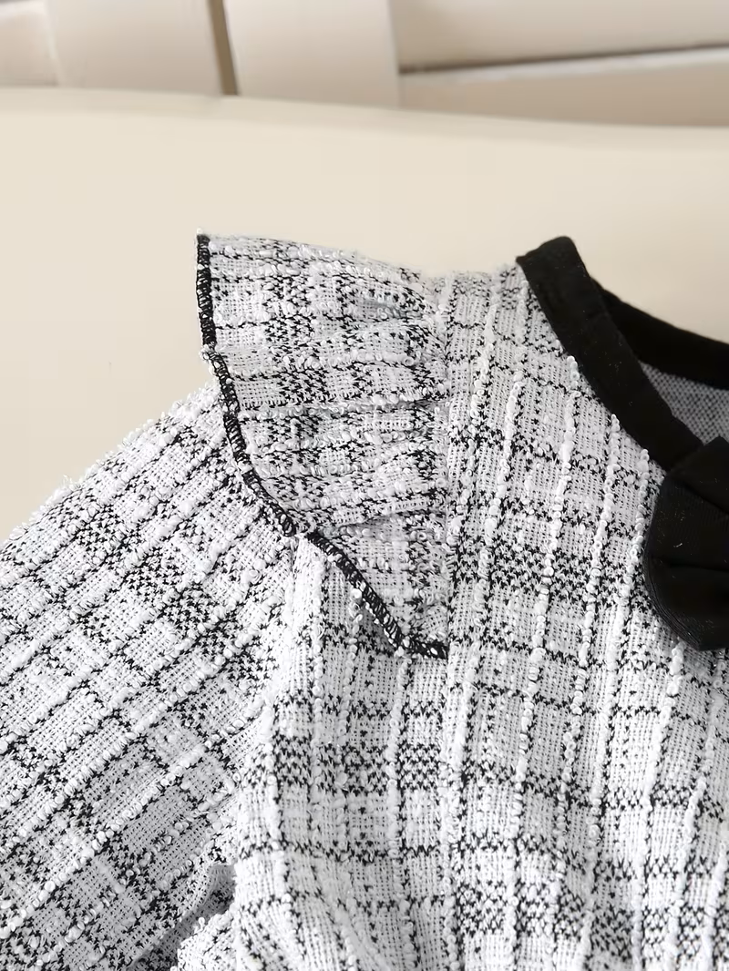 Zimska haljinica za bebe devojčice – 9-12 meseci (veličina 80) Uživajte u udobnosti i stilu vaše male princeze sa ovom prelepom zimskom haljinicom. Haljinica je sivo bele karirane boje sa suptilnim crnim detaljima, savršena za praznične i svakodnevne prilike. Ima elegantnu crnu masnicu i karneriće na ramenima koji dodaju nežan i sladak izgled. Zakopcava se jednim dugmetom pozadi. Dugi rukavi sa gumicom na kraju čuvaju toplinu, dok je materijal mekan i nežan, prijatan za osetljivu kožu bebe. Idealna je za zimske dane, igre i posebne trenutke, kombinujući udobnost i šarm u jednom.