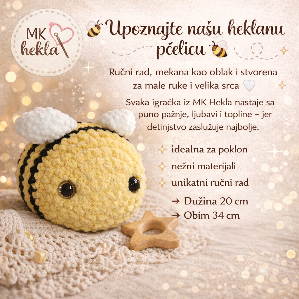 Upoznaj moju heklanu pčelicu 🐝 Ručni rad, mekana kao oblak i stvorena za male ruke i velika srca 🤍 Svaka igračka iz MK Hekla nastaje sa puno pažnje, ljubavi i topline – jer detinjstvo zaslužuje najbolje. ✨ idealna za poklon ✨ nežni materijali ✨ unikatni ručni rad Duzina 20 cm Obim 34 cm