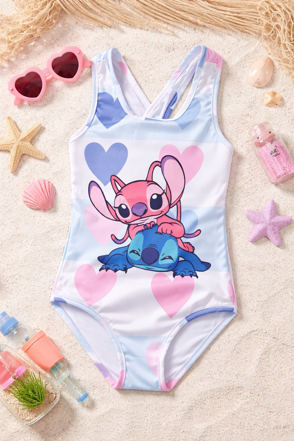 Jednodelni kupaći za devojčice sa preslatkim motivom Stitch-a Savršen kupaći za male ljubiteljke veselih i nežnih dezena Ukrašen srcima i simpatičnim likovima, idealan za leto, more i bazen Udoban i elastičan materijal Prijatan za nošenje i brzo se suši Stabilne bretele za sigurno i bezbrižno uživanje Jastucici na grudima Savršen izbor za sunčane dane i razigrane avanture Velicina: 110/116 5-6 god