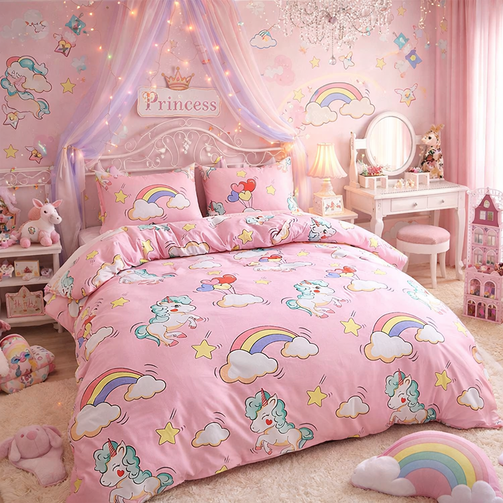 Učinite svaku noć čarobnom uz preslatku posteljinu Unicorn Dream. Razigran dezen sa jednorozima, duginim bojama, zvezdicama i oblačićima stvara bajkovitu atmosferu u dečjoj sobi i donosi osmeh pred spavanje. Set se sastoji od: – navlake za jorgan – 2 jastučnice Navlaka za jorgan se zatvara rajsferšlusom, praktično i diskretno. Jastučnica je na preklop, bez dugmadi i zipova, kako bi spavanje bilo udobno i bez smetnji. Materijal je mekan, lagan i prijatan na dodir, nežan prema koži i jednostavan za održavanje, idealan za svakodnevnu upotrebu. Posteljina je u istom dezenu sa obe strane. Dimenzije: Navlaka za jorgan: 135 x 200 cm Jastučnica: 75 x 50 cm Savršen izbor za male sanjalice koje vole jednoroge, dugu i čarobne motive.