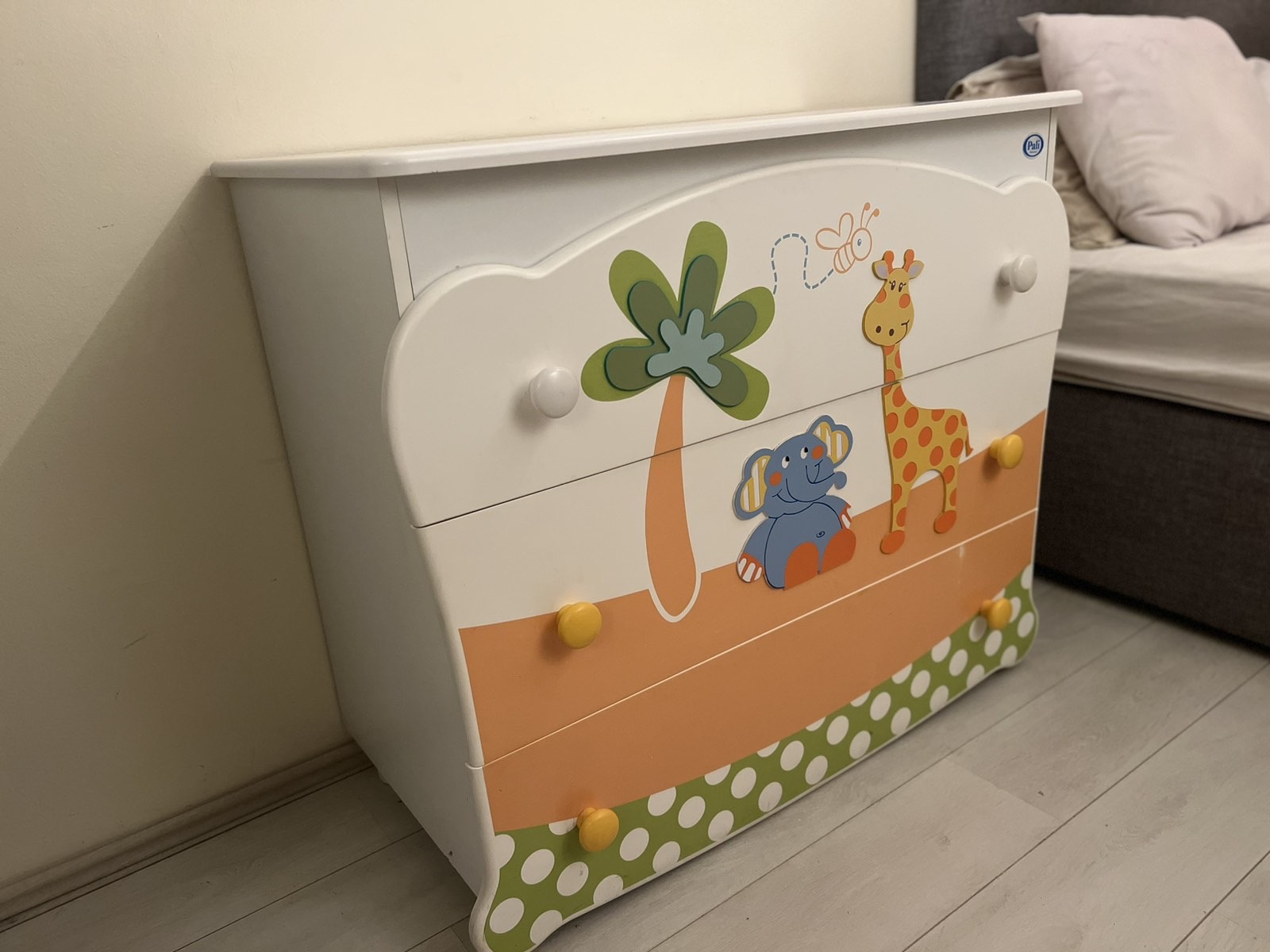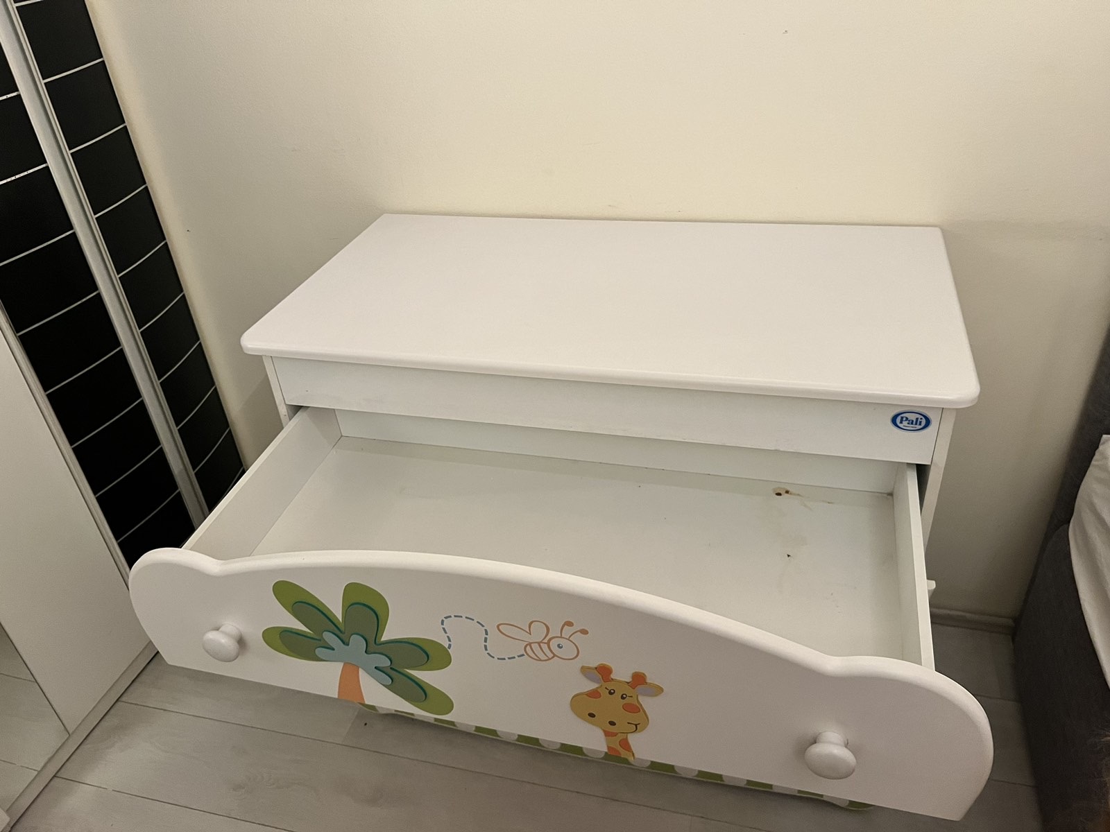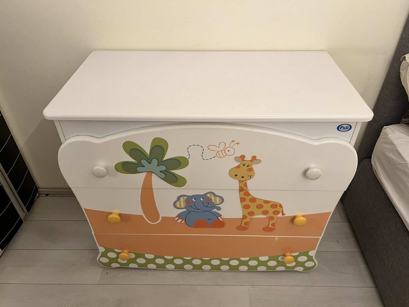 GIGI E LELE komoda je dizajnirana za skladištenje svih vrsta stvari za vašu bebu. Komoda sadrži: 3 fioke. Veliki prostor za odlaganje, okrugle ručke u boji (bele, žute) Čvrsti nogari.