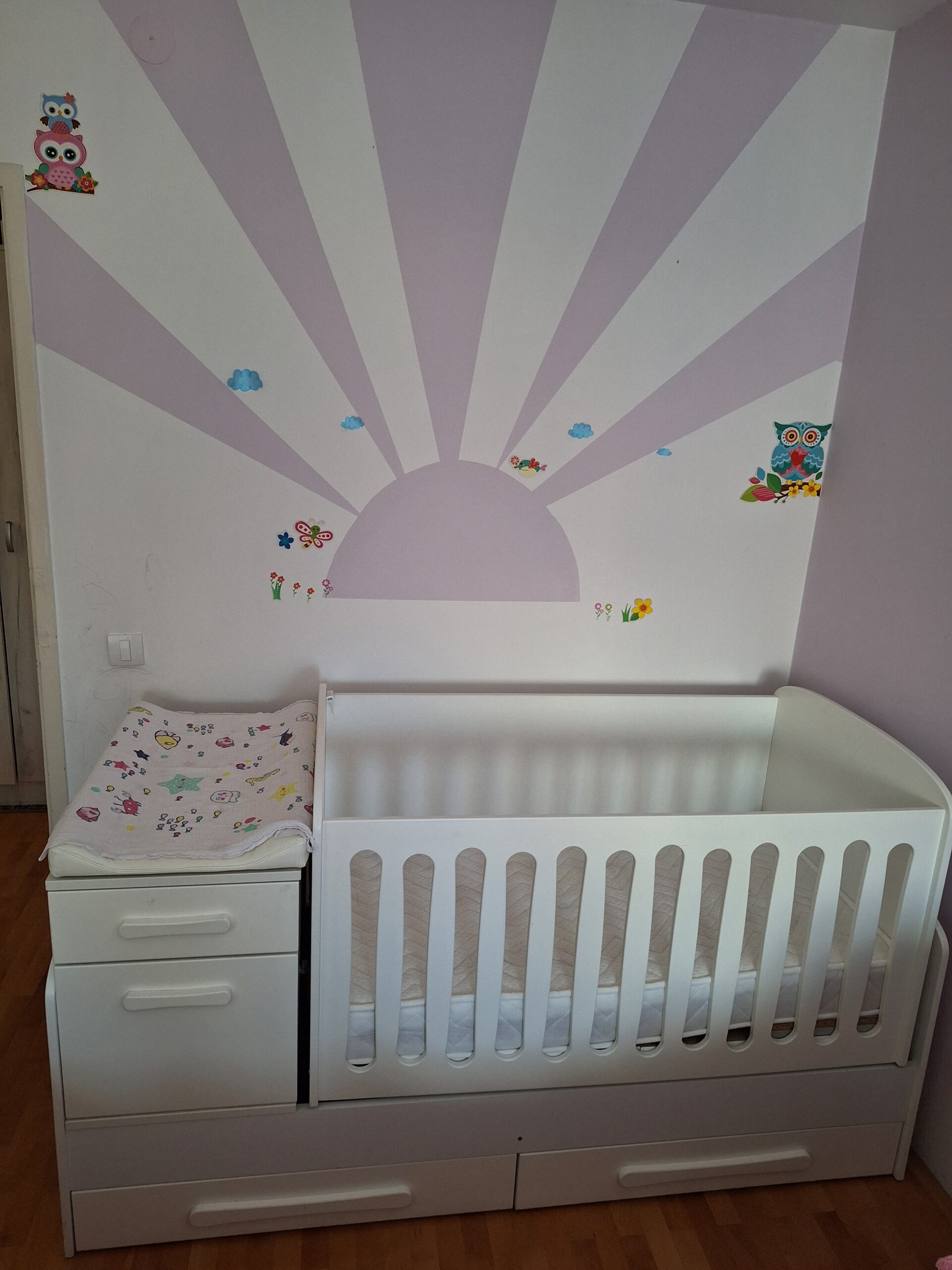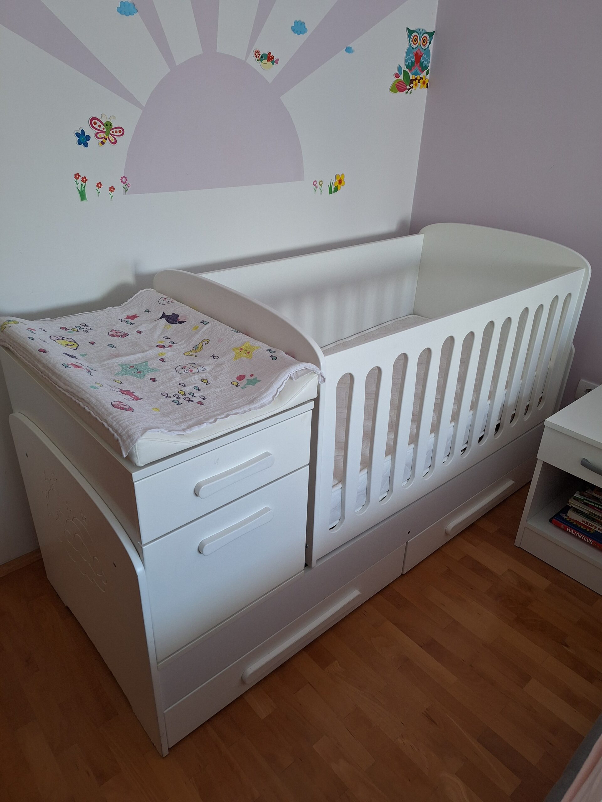 Sastoji se od ● Kreveca za spavanje na kojem se nalazi i mehanizam za ljuljanje (koji lako moze da se fiksira postavljanjem srafova sa strane ogradice krevetica) ● Komoda za presvlacenje, koja se sastoji od dve fioke – jedne plice i jedne dublje, a na samu komodu se postavlja podloga za presvlacenje bebe. ● Ima jos dve fioke ispod kreveca za odlaganje stvari. ● Kada beba odraste, pomeranjem kreveca i komode dobija se deciji krevet, ● Okretanjem kreveca dobija se radni sto sa fiokama (komoda). Mi smo ga koristili iskljucivo kao krevetac sto je prikazano na dve slike. A kako izgedaju sve mogucnosti upotrebe vide se na slici koju smo preuzeli od proizvodjaca. Spoljem dimenzije kreveca je 173 cm, sirina 73 cm Krevetac je kupljen 2018. godine, u odlicno je stanju i ocuvan. Ne saljemo postom, samo licno preuzimanje (Beograd). Za sve dodatne informacije slobodno pitajte.