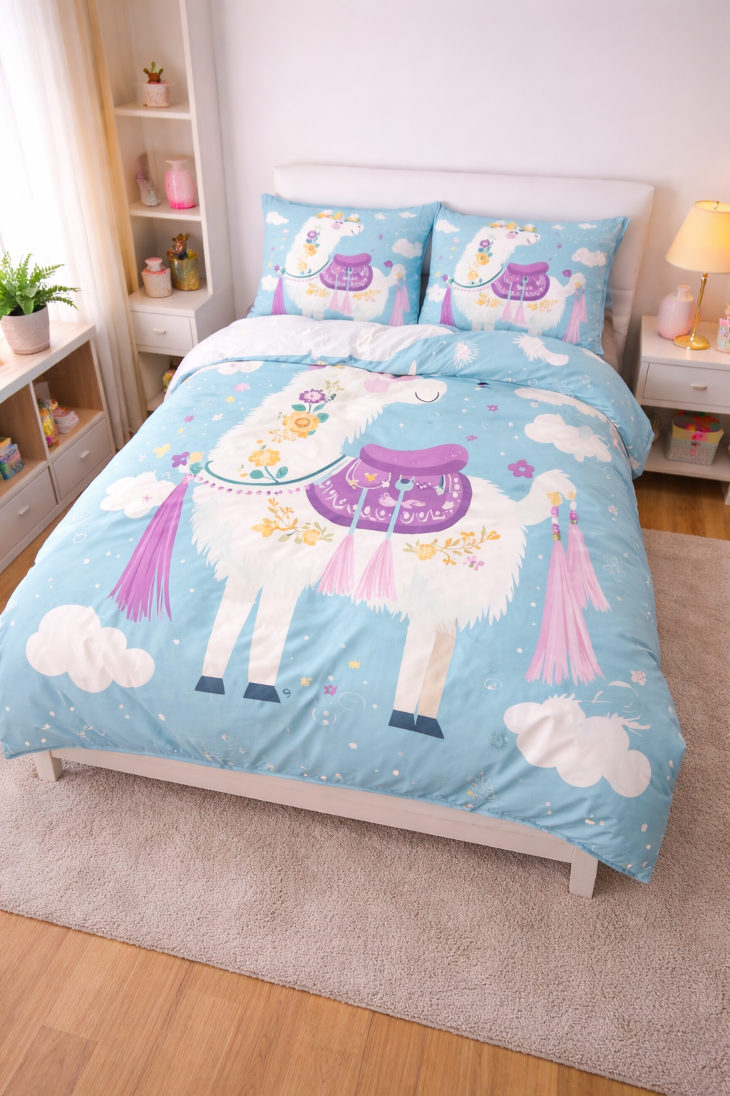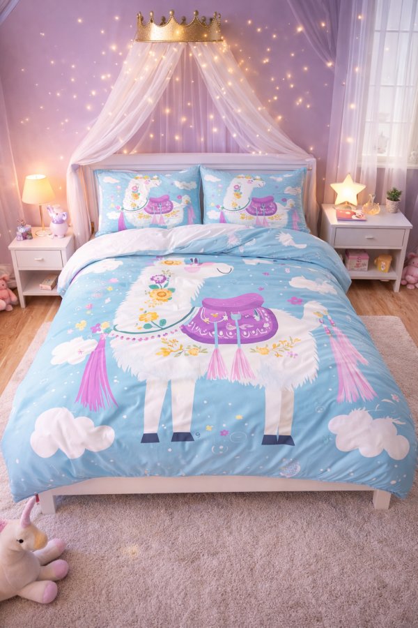 Unesite vedrinu, maštu i toplinu u spavaću sobu uz posteljinu Čarobna Lama. Nežan i razigran dezen sa simpatičnom lamom, cvetnim detaljima i pastelnim tonovima stvara bajkovitu atmosferu i idealan je izbor za dečju sobu, ali i za sve koji vole vesele i posebne motive. Posteljina se sastoji od: – navlake za jorgan – dve jastučnice Navlaka za jorgan je dizajnirana da pruži udobnost i lep izgled kreveta, dok su jastučnice usklađene sa motivom i doprinose celokupnom dekoru sobe. Materijal je mekan, lagan i prijatan na dodir, lepo pada i obezbeđuje udoban san. Posteljina se lako održava i pogodna je za svakodnevnu upotrebu. Navlaka za jorgan je dvostrana – sa jedne strane je ovaj šareni, bajkoviti dezen, dok je druga strana jednobojna bela, što omogućava lako menjanje izgleda kreveta. Zakopčavanje je na rajsferšlus, diskretno i praktično. Jastučnica je na preklop, bez dugmadi i rajsferšlusa, za prijatan i miran san. Dimenzije: Navlaka za jorgan: 135 x 200 cm Jastučnice: 75 x 50 cm (2 komada) Savršen izbor za one koji žele da unesu dozu čarolije, boja i nežnosti u svoj prostor za spavanje.