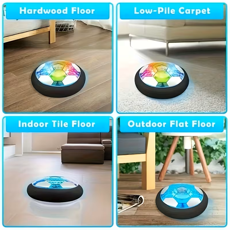 Svetleća lebdeća fudbalska lopta – igračka za decu Zabavna i bezbedna lebdeća lopta sa LED svetlima koja klizi iznad poda i pruža sate aktivne igre u zatvorenom prostoru. Savršena je za decu svih uzrasta, čak i u manjim prostorijama. Karakteristike: Lebdi iznad poda zahvaljujući vazdušnom jastuku Mekana zaštitna ivica – ne oštećuje nameštaj i zidove Šarene LED lampice koje se pale tokom igre Lagana i jednostavna za upravljanje nogama Tih rad, idealna za igru u stanu Pogodna za različite površine: parket pločice laminat tepih sa kratkom dlakom ravne spoljne površine Dimenzije: prečnik: oko 18 cm visina: oko 6 cm Napajanje: radi na baterije (jednostavna ugradnja – poklopac na donjoj strani) – nisu ukljucene u cenu Zašto je deca vole: podstiče kretanje i koordinaciju atraktivna zbog svetlosnih efekata bezbedna alternativa klasičnoj lopti u kući Idealna igračka za aktivnu igru u zatvorenom, druženje sa porodicom i zabavu bez brige o lomljenju stvari.