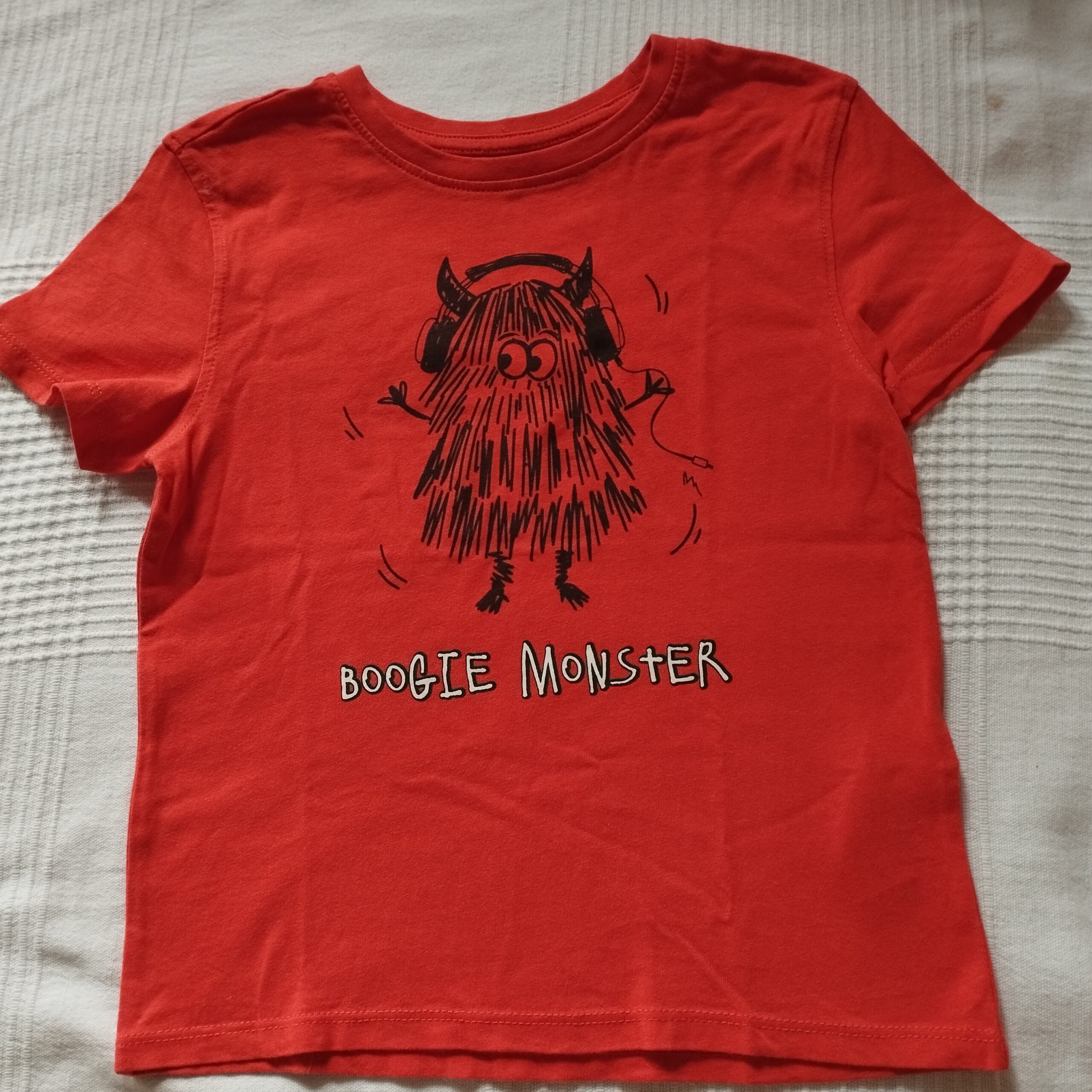 Majica, kratak rukav, za dečaka. Narandžaste boje, sa crnom aplikacijom. Veličina 100. Vrlo očuvana.