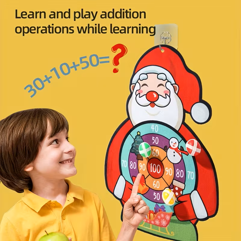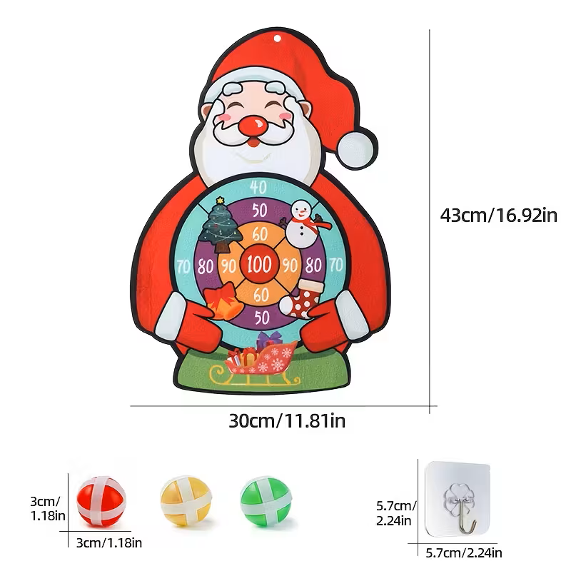 Božićna igra – Pikado sa Deda Mrazom Zabavna božićna igra koja donosi osmeh i uzbuđenje za celu porodicu! Pikado sa motivom Deda Mraza savršen je način da se deca zabave tokom praznika, razvijajući pritom preciznost i koncentraciju. Opis proizvoda: Mekani pikado u obliku Deda Mraza Dimenzije table: 43 × 30 cm U pakovanju: 1 pikado tabla, 3 loptice sa čičak trakama i 1 kuka za kačenje Prečnik loptice: 3 cm Jednostavno se postavlja na zid pomoću priložene kuke Karakteristike: Bezbedno za decu – bez oštrih ivica i iglica Lagano, lako prenosivo i pogodno za igru u zatvorenom prostoru Idealan poklon za božićne praznike ili porodična druženja Prednosti: Razvija koordinaciju ruka–oko i preciznost Pruža zabavu za decu i odrasle Unosi veselje i praznični duh u dom Savršena praznična aktivnost za sve uzraste – bacite loptice, sakupite poene i neka najbolji Deda Mraz pobedi!