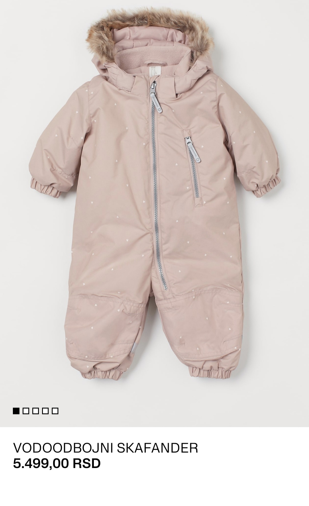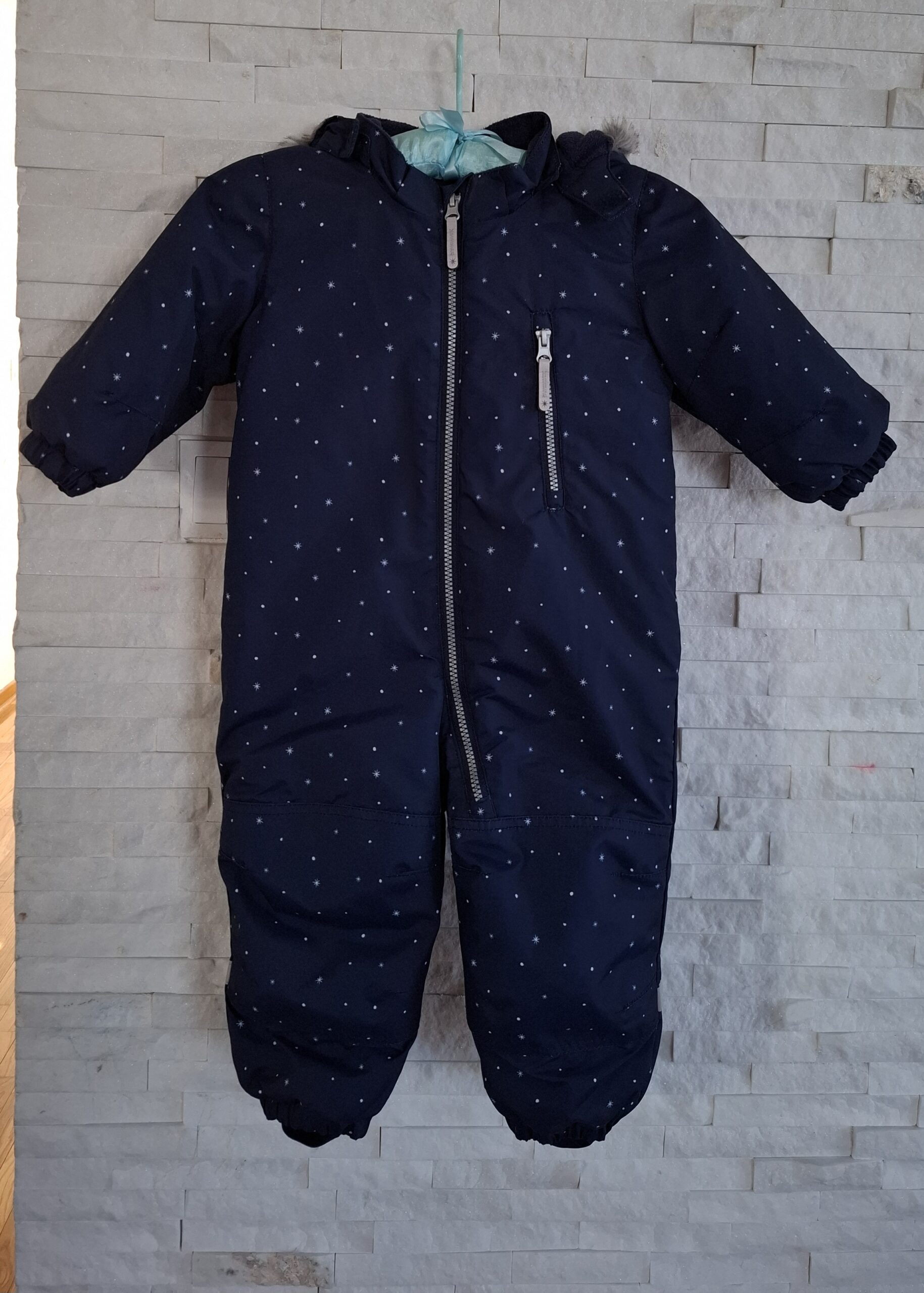 H&M skafander za bebe. Veličina 86, od 12 do 18 meseci. Tabela veličina priložena na poslednjoj slici. Skafander je obučen jednom i to za šetnju u kolicima, tako da je faktički kao nov. Nema ni jedan znak nošenja ni oštećenja. Kvalitetan, vodootporan materijal. Kapa se skida. Na nogavicama ima lastiš. Boja je teget sa belim zvezdicama i grudvicama. Na sajtu H&M nov košta 5.499 din (trenutno dostupan u dezenu za devojčice, zato je poslednja slika roze varijanta skafandera).