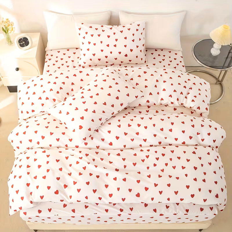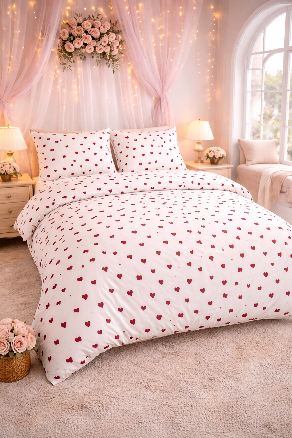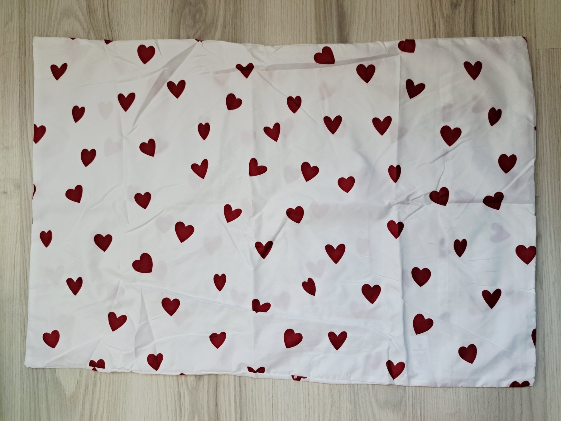 Unesite toplinu i romantičnu notu u svoju spavaću sobu uz nežnu posteljinu sa sitnim crvenim srcima na beloj podlozi. Minimalistički, ali efektan dezen savršeno se uklapa u moderan, skandinavski ili romantičan enterijer. Posteljina je dvostrana – isti dezen nalazi se sa obe strane, tako da krevet uvek izgleda uredno i skladno namešten. Set sadrži: – Navlaku za jorgan 135 x 200 cm – 2 jastučnice 75 x 50 cm Navlaka za jorgan se zatvara praktičnim rajsferšlusom, dok su jastučnice izrađene na preklop, bez dugmića i zatvarača koji bi smetali tokom spavanja. Materijal je mekan, lagan i prijatan na dodir, pruža udobnost tokom cele noći i jednostavan je za održavanje. Savršen izbor za sve koji vole diskretan, romantičan stil i detalje koji unose toplinu u prostor ili kao poklon za rodjendan, Dan Zaljubljenih, 8. Mart…