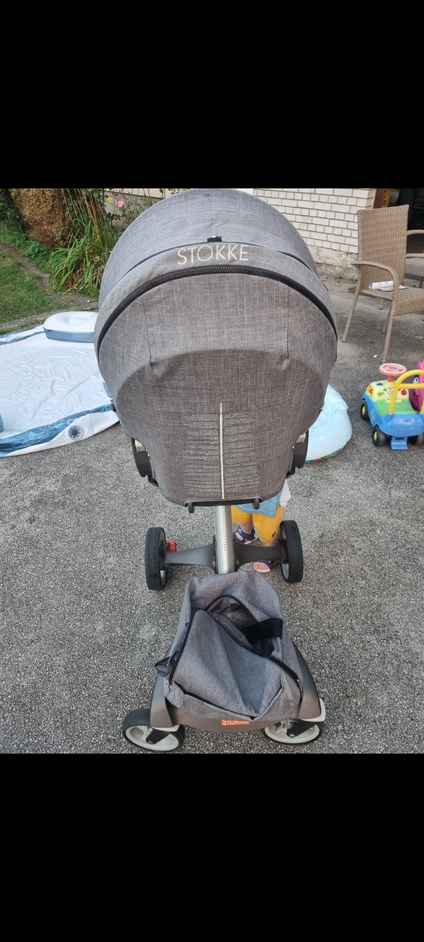 Stokke V4 kolica u black malange boji,uz njih ide jastuce za bebe do 6 meseci,navlaka za kisu, komarce i torba.