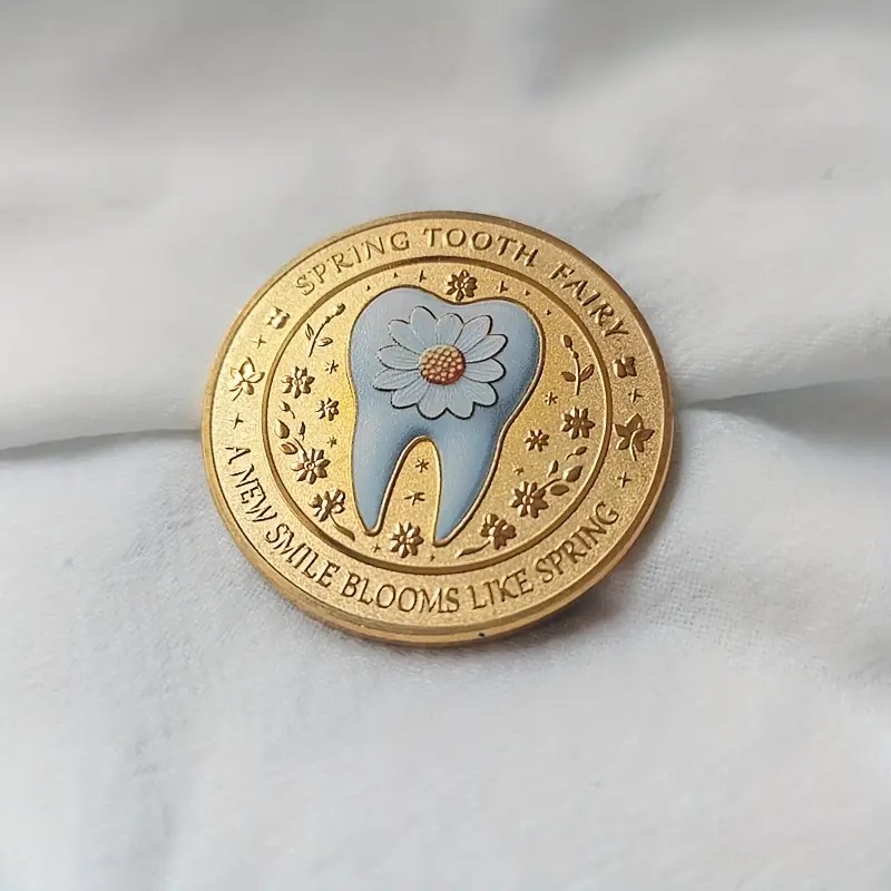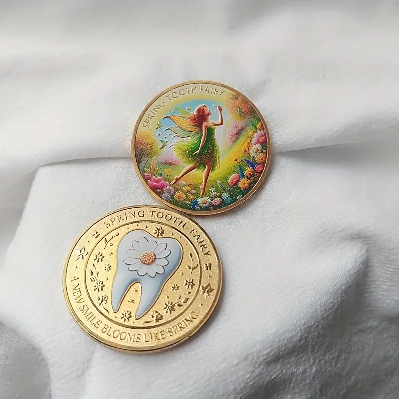 Poklon novčić Vile zubić je divna tradicija koja dodaje malo magije iskustvu gubitka zuba. Obično, nakon što dete stavi izgubljeni zub pod jastuk, Zubić ga posećuje tokom noći, menjajući zub za poseban novčić. Ovi novčići često dolaze u različitim oblicima, napravljeni po meri na kojima je prikazana sama Vila Zubić. Uzbuđenje zbog otkrivanja novčića ujutru čini celo iskustvo očaravajućim. Za mnogu decu simbolizuje prelaz — obred prelaska u odrastanje. Dukat može poslužiti i kao opipljiva uspomena, podsećajući decu na njihove rane godine i magiju koja je nekada ispunjavala njihove noći. Kako deca rastu, ovi novčići Vile zubić mogu postati dragi mementi, često spremljeni u posebnu kutiju ili izloženi u kolekciji, otelotvorujući i radost detinjstva i lepa sećanja na voljenu tradiciju. Zlatni novcic poklon Boja: zlatna Materijal: metal Dimenzije: 4 cm Motiv: Zubic Vila – Tooth Fairy Prolece sa jedne strane i zub sa druge strane sa natpisom `Spring Tooth Fairy / A new smile blooms like spring`