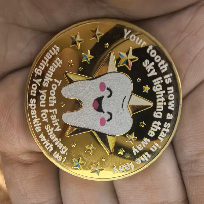 Poklon novčić Vile zubić je divna tradicija koja dodaje malo magije iskustvu gubitka zuba. Obično, nakon što dete stavi izgubljeni zub pod jastuk, Zubić ga posećuje tokom noći, menjajući zub za poseban novčić. Uzbuđenje zbog otkrivanja novčića ujutru čini celo iskustvo očaravajućim. Za mnogu decu simbolizuje prelaz — obred prelaska u odrastanje. Dukat može poslužiti i kao opipljiva uspomena, podsećajući decu na njihove rane godine i magiju koja je nekada ispunjavala njihove noći. Kako deca rastu, ovi novčići Vile zubić mogu postati dragi mementi, često spremljeni u posebnu kutiju ili izloženi u kolekciji, otelotvorujući i radost detinjstva i lepa sećanja na voljenu tradiciju. Zlatni novcic poklon Boja: zlatna Materijal: metal Dimenzije: 4 cm Motiv: Zubic Vila – Tooth Fairy i dete sa jedne strane i zub sa druge